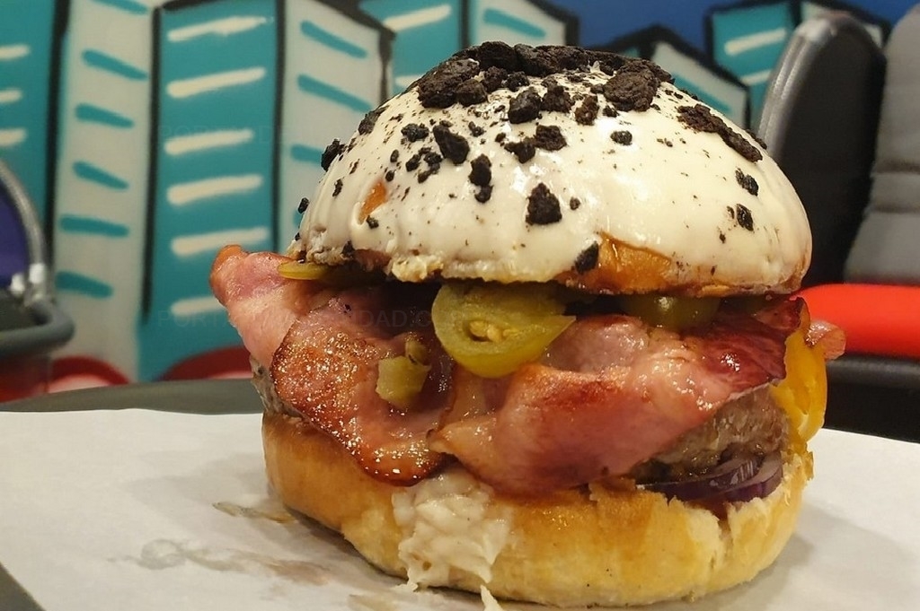200 grs. de Carne, Barbacoa, Cebolla Morada, Queso Cheddar, Queso Gouda, Jalapeños, Bacon y su mayor atracción: Pan cubierto de Chocolate Blanco y Galleta Oreo (Dulce, Ahumado y Picante, una mezcla alucinante)