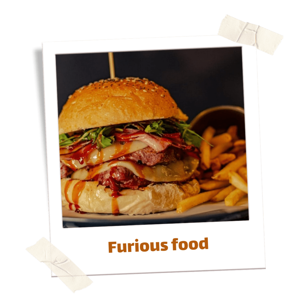200 grs. de Carne, Bacon Caramelizado, Pepinillos, Queso Cheddar, Barbacoa de Chipotle. Bañanda en Salsa de Queso y Cebolla Crispy