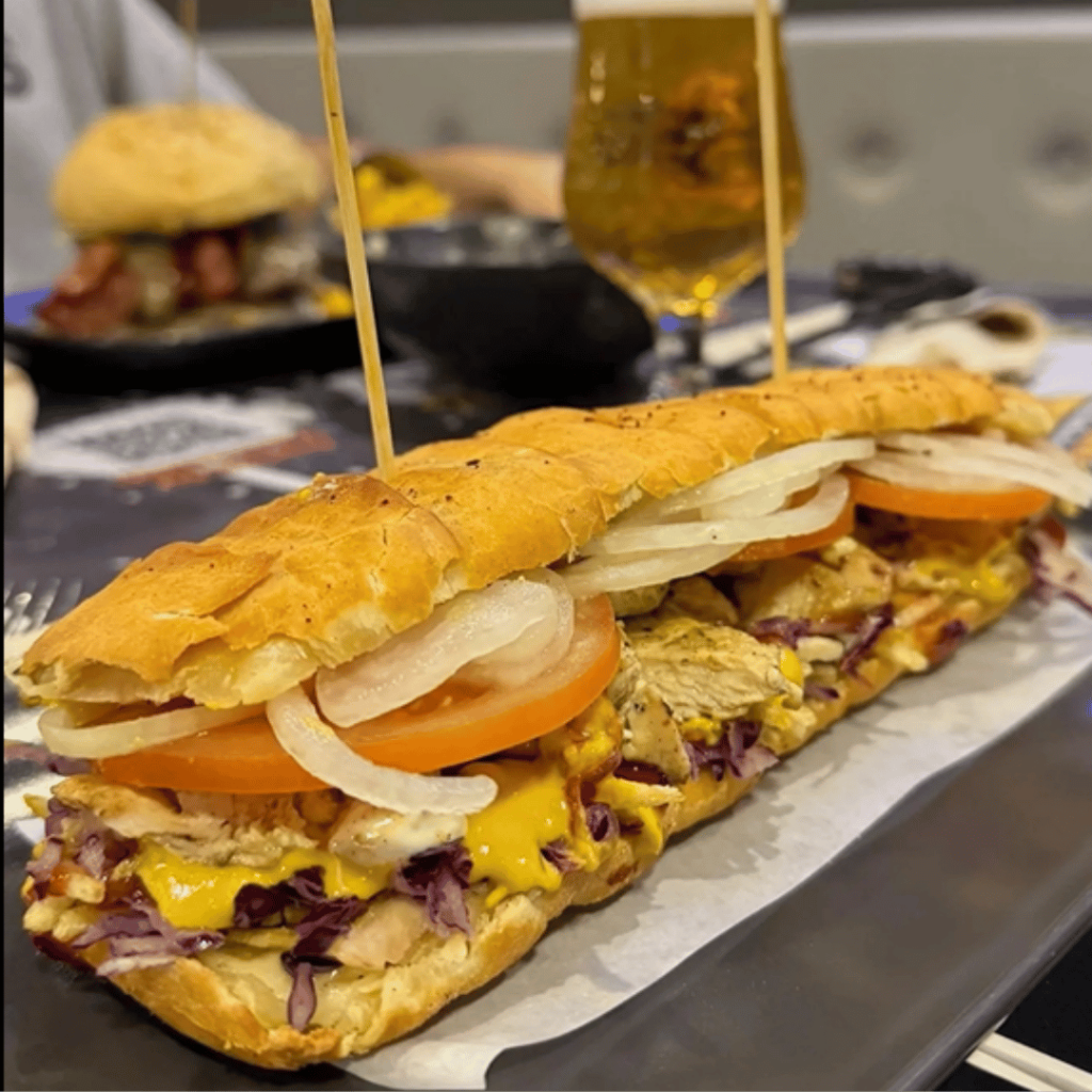 200 grs. de Carne, Mayonesa Chipotle, Cebolla Crunchy, Queso Provolone, Pulled Pork y Cebolla Caramelizada