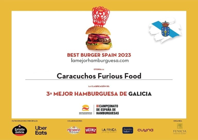 Se trata de la burguer La Chiqui de Caracuchos Furious Food, en rúa Sevilla 12, que se posicionó en el tercer puesto en el ranking «Mejor Hamburguesa de Galicia 2023», enmarcado en el campeonato. La propuesta es una burguer creada con un concepto minimalista y conservador, elaborada con blend de carne de vaca cubierta con queso provolone, beicon ahumado y rúcula sobre una cama de cebolla crunchy bañada en salsa de reducción de whisky>>